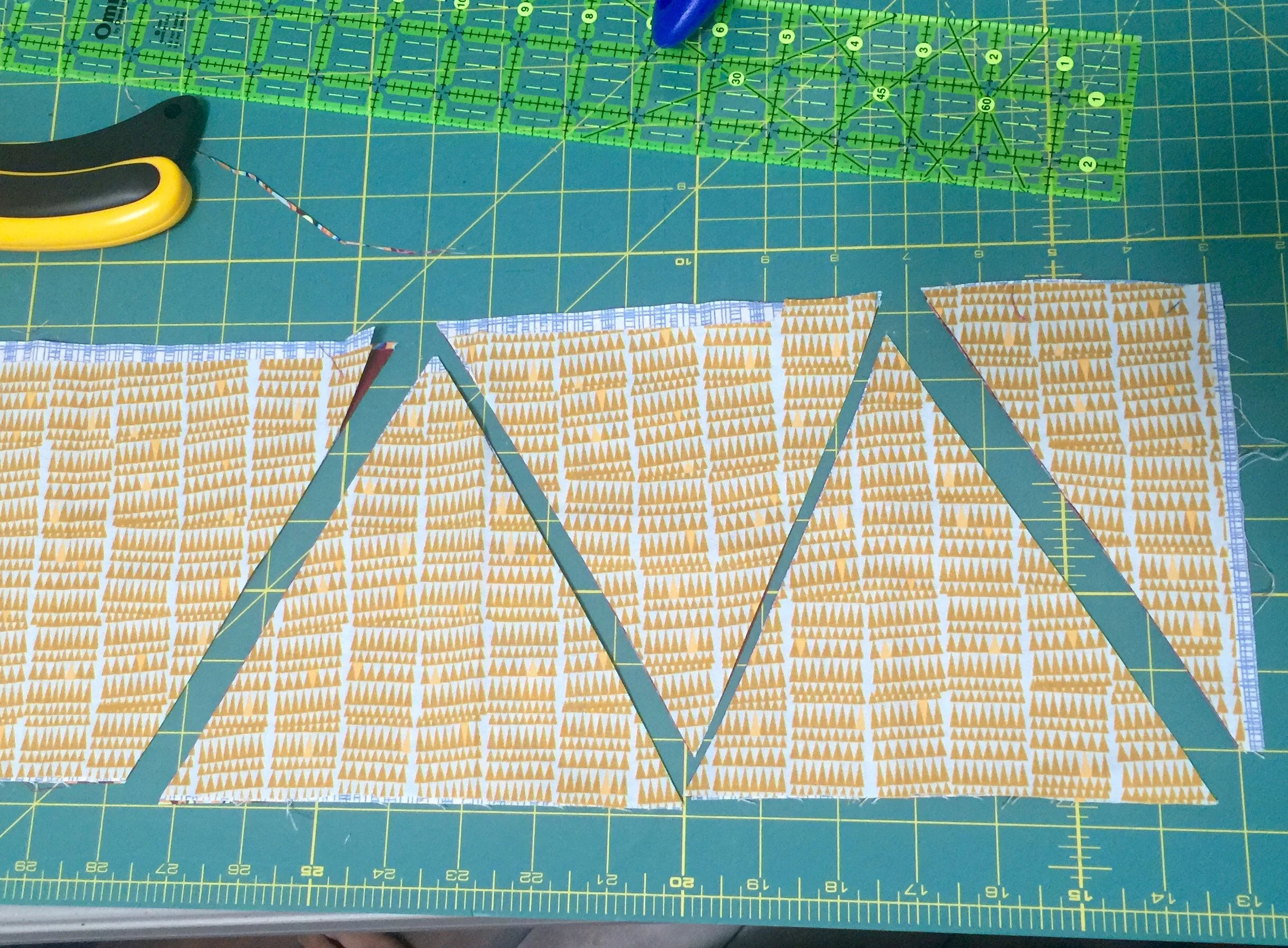 I cut four rectangular pieces of fabric with scissors - starting with one of my fabrics which was a rectangle scrap, and just making three more pieces in the same shape. I stacked all four on top of each other (right side up) and then used my rotary cutter to slice them into triangle shapes. Then I shuffled the stacks a little and started piecing together four rows.