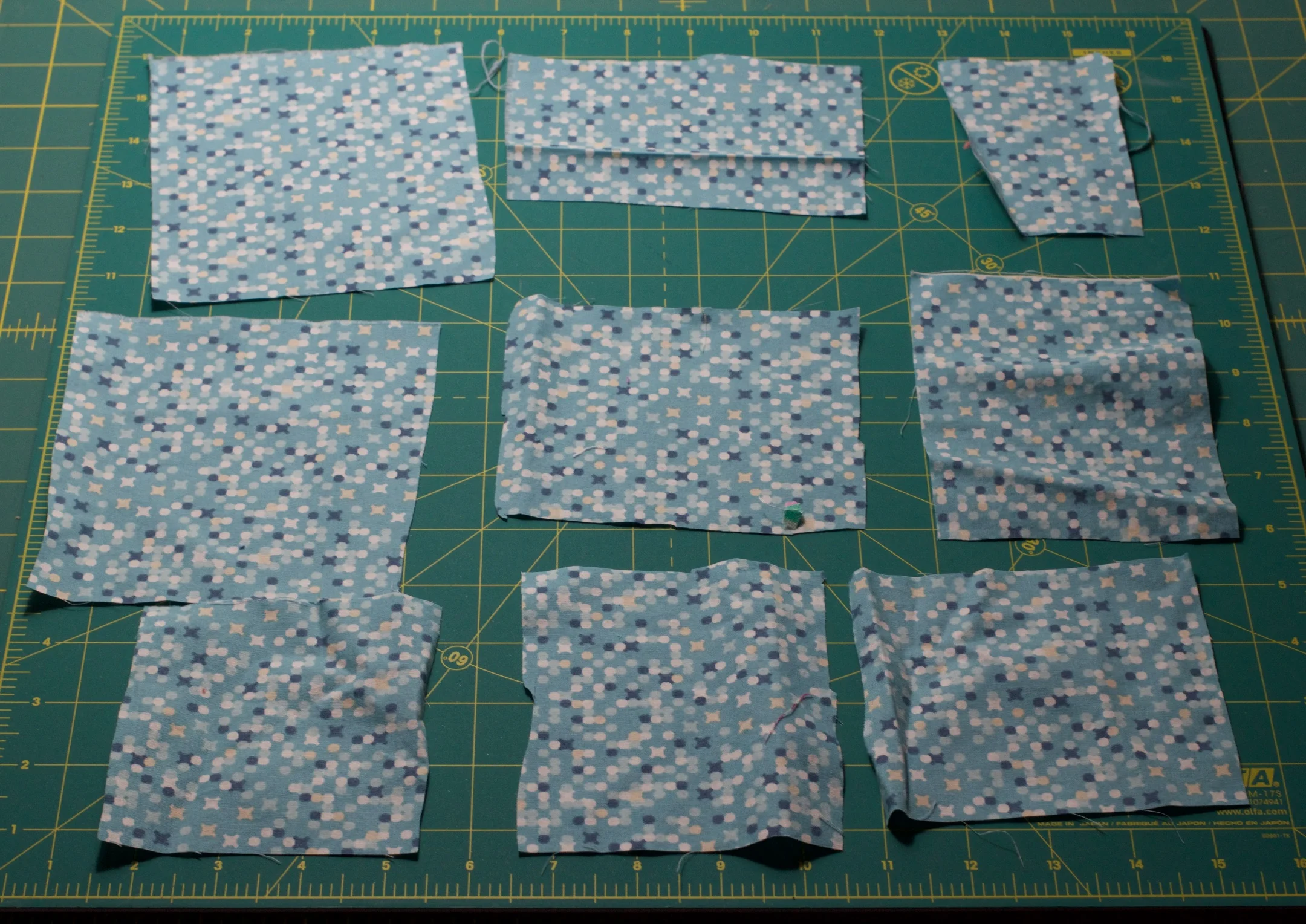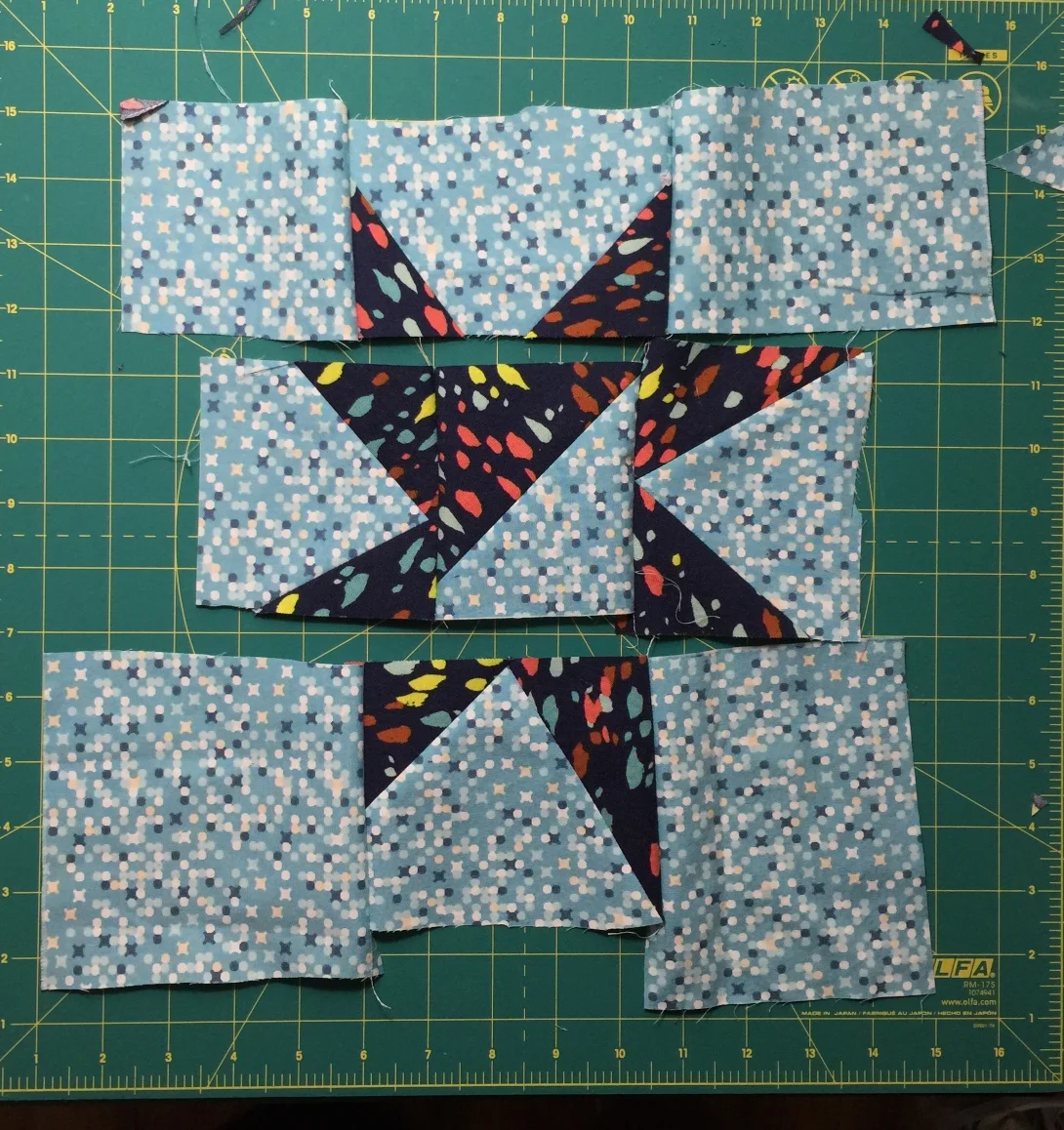 Start by cutting out eight or nine background shapes - squares or rectangles. I like to use scissors because I can't cut straight with scissors to save my life, so it helps with the liberation. Your shapes should be only roughly the same size and definitely not the same shape. You want nine shapes only if you want your star center to the the same as your background. If you want the center to match your points, make a squareish or rectanglish shape out of the points fabric. Or use something completely different. I made a kind of wonky HST by sewing two scrap triangles together for one of mine - that's fun too!