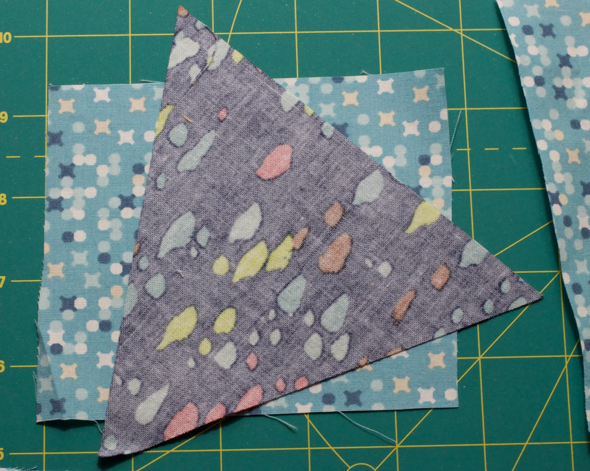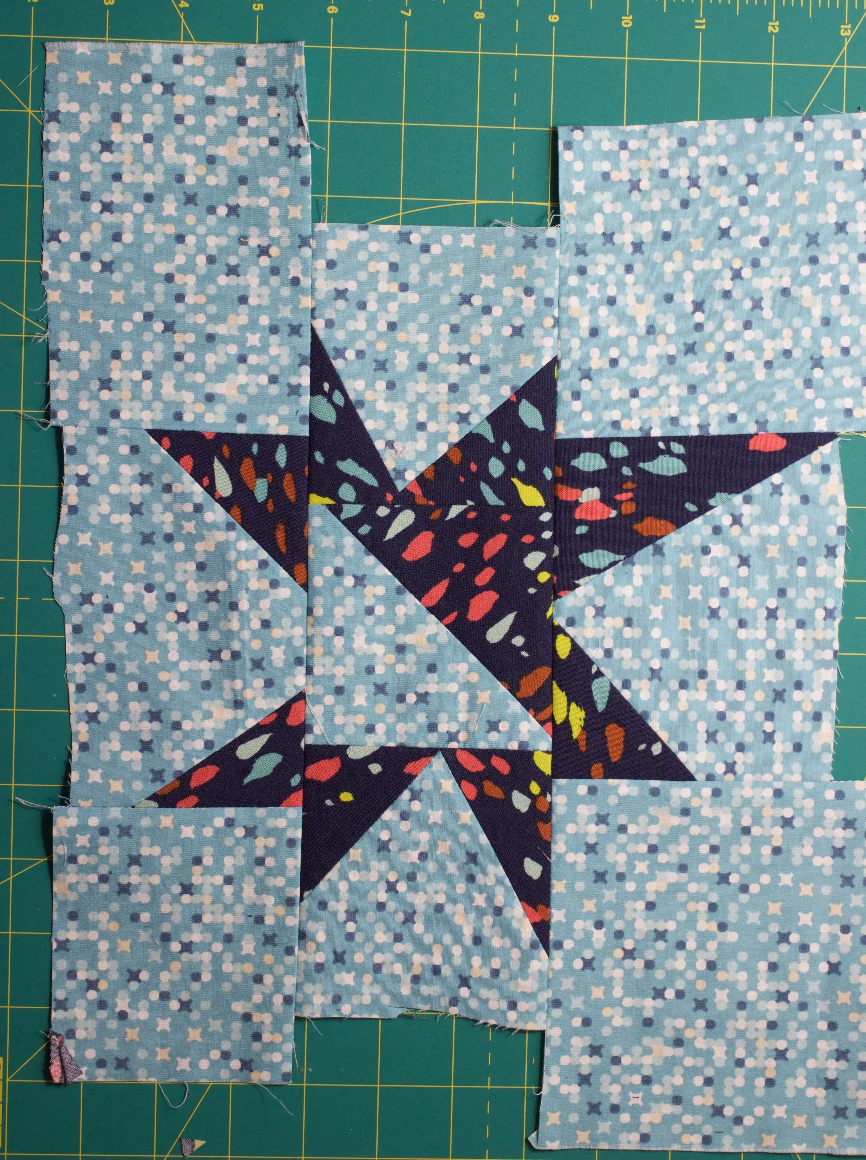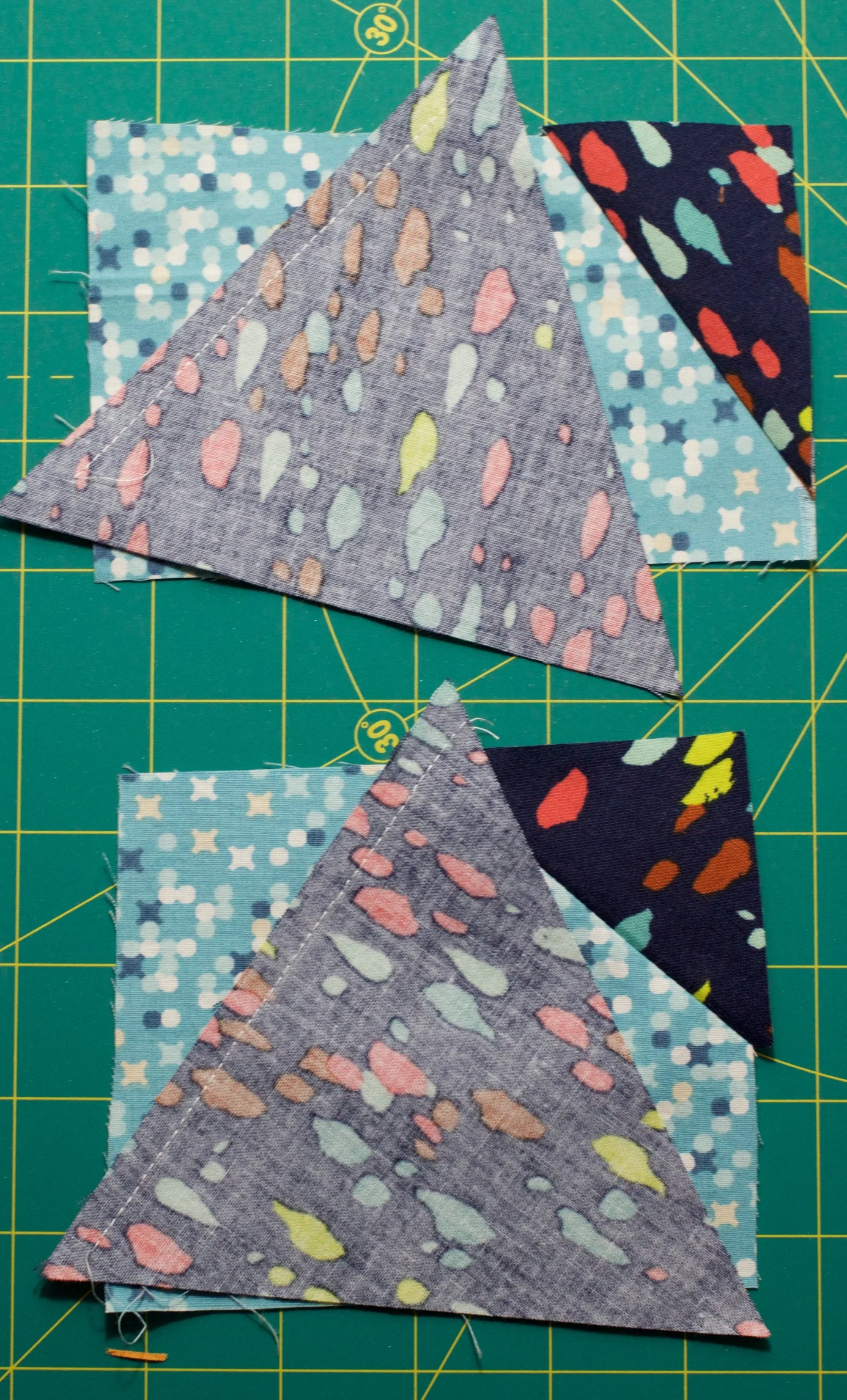 Grab some background shapes and start sewing points onto them, just like you did with the mildly liberated stars. Just place your two fabrics right-sides facing and sew them together at an angle with a 1/4 seam. The only thing you need to think about here is that your points fabric will cover the background fabric when you flip it over. Do not worry about whether you will have enough seam allowance to keep your points pointy. Blunted points are wonderful!