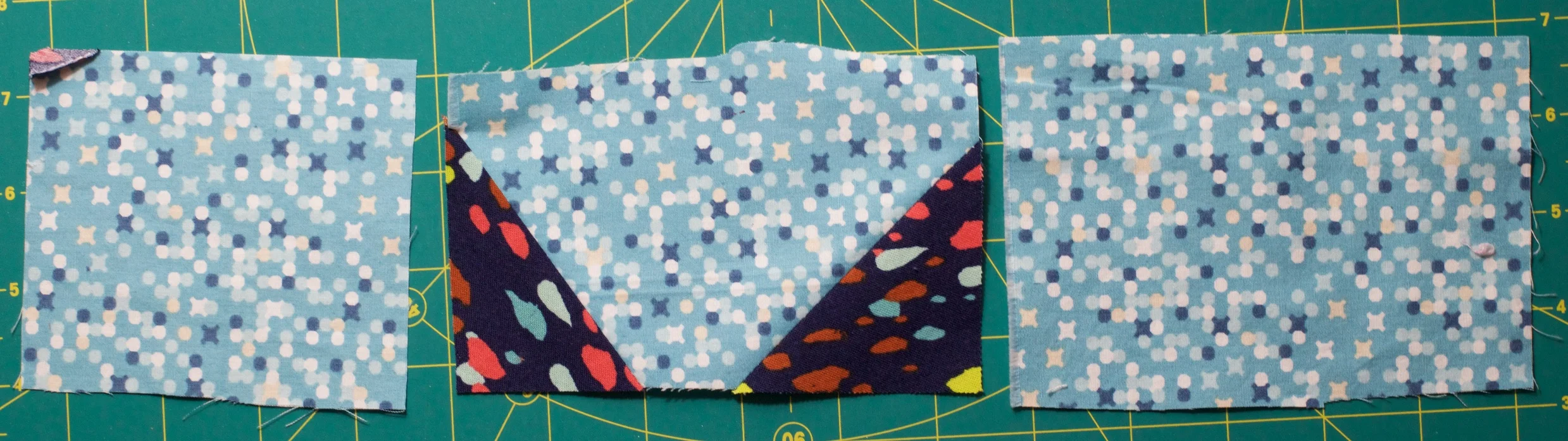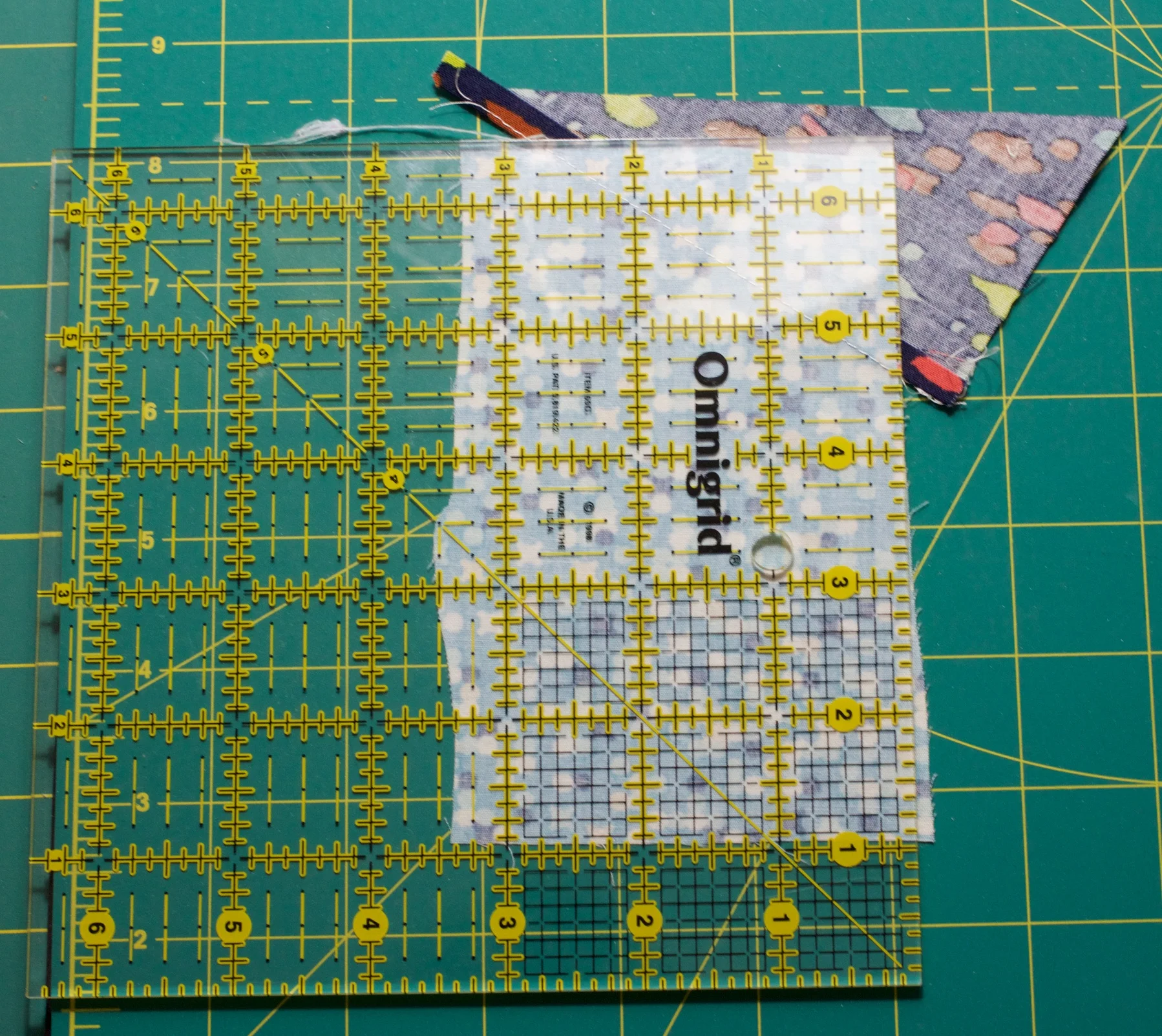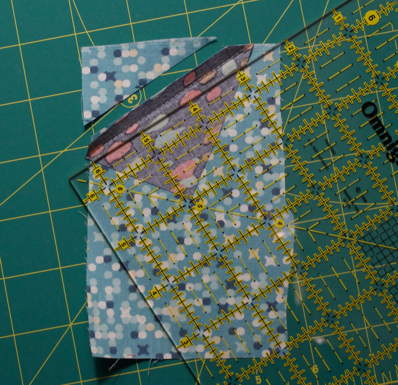Press the seam between the point and background. Flip it over and cut off the excess points fabric around your corner. No need to be perfectly square or careful here, just lose the extra fabric.